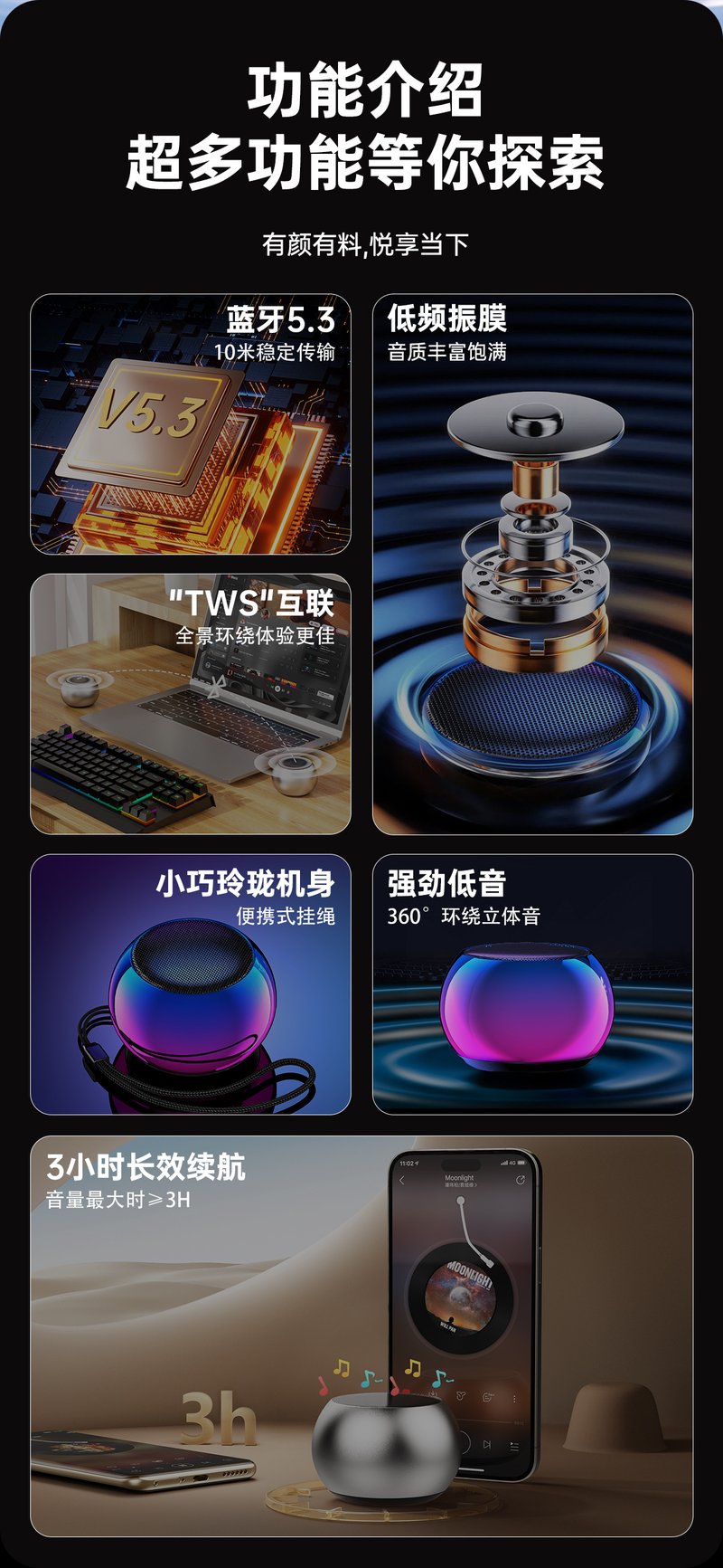 15分鐘前炫彩無線藍牙音箱,戶外便攜,小音響大音量,多重音效, 360°全向音效 - 5入組 均價339!NT$1699